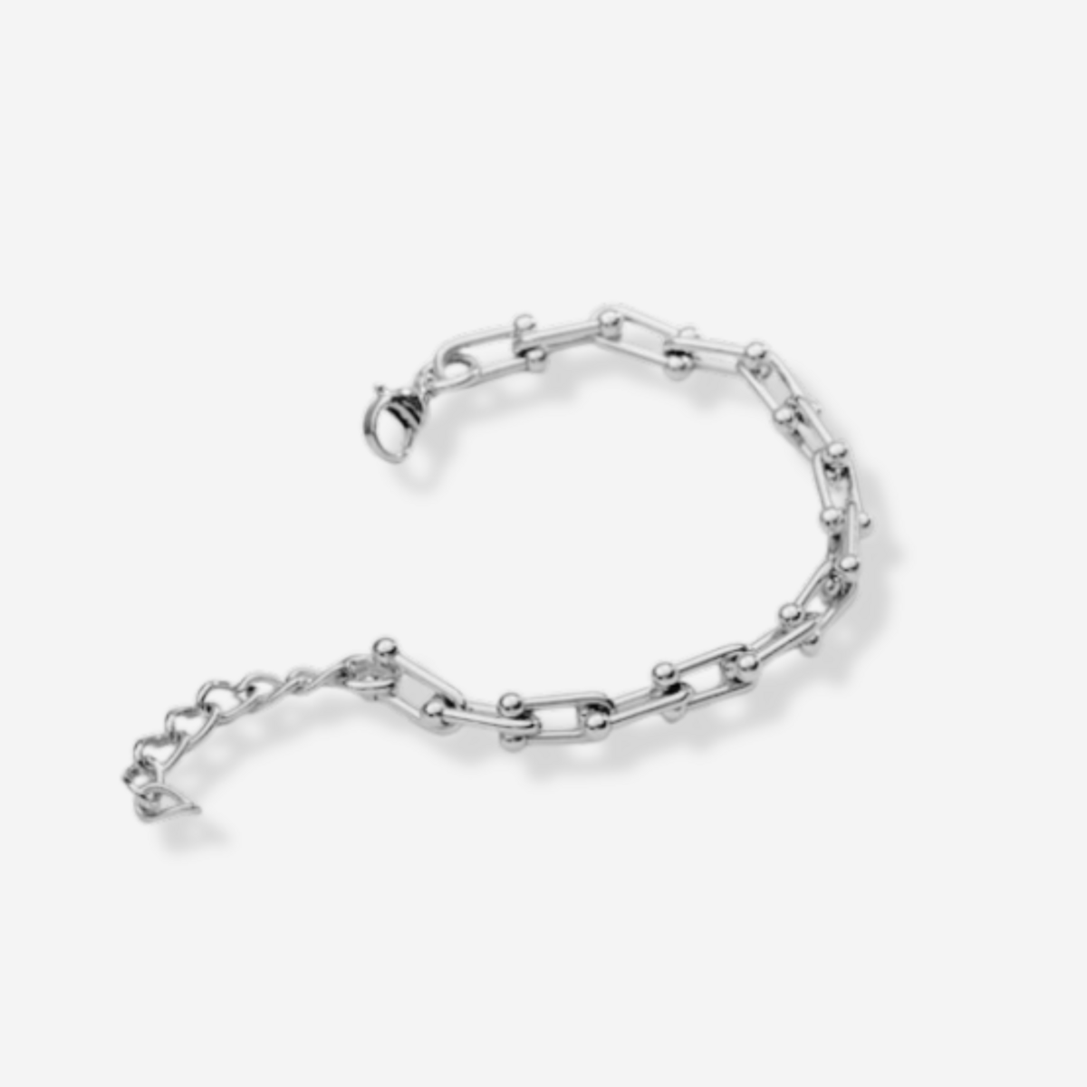 Armband Mariah – Grof statementstuk. Materiaal: Handgemaakt van roestvrij staal met hoogwaardige 18k vergulde / gerhodineerde (zilver) Afmetingen: Kettinglengte: 16 cm + 5 cm verlenging