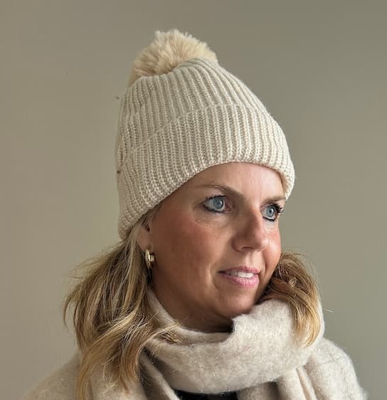 Met deze gebreide muts van Zaza’s ga je stijlvol en warm de winter door. De crèmekleurige beanie is gemaakt van zacht, comfortabel materiaal en afgewerkt met een fluffy pompon van imitatiebont voor een speelse en elegante look.