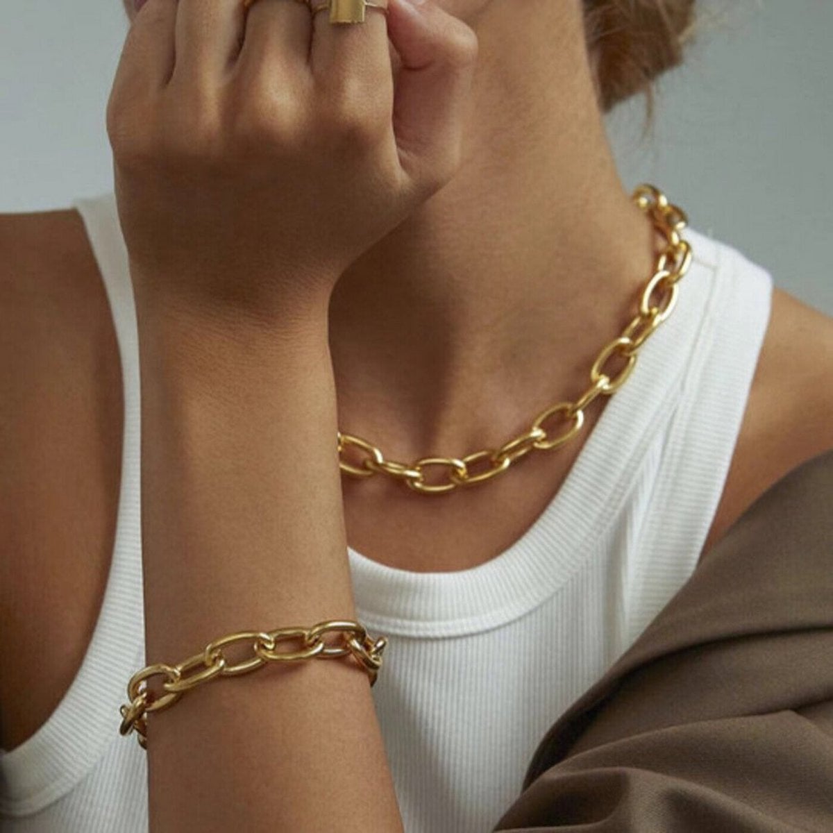 Dikke schakelarmband – met grote schakels en decoratief kapittelslot. Details: Handgemaakt van roestvrij staal met hoogwaardige 18k goudlaag of zilver Afmetingen: 20 cm lang of 17 cm lang