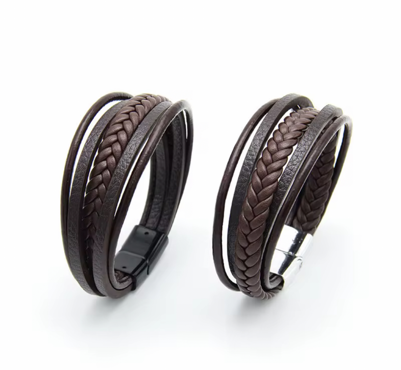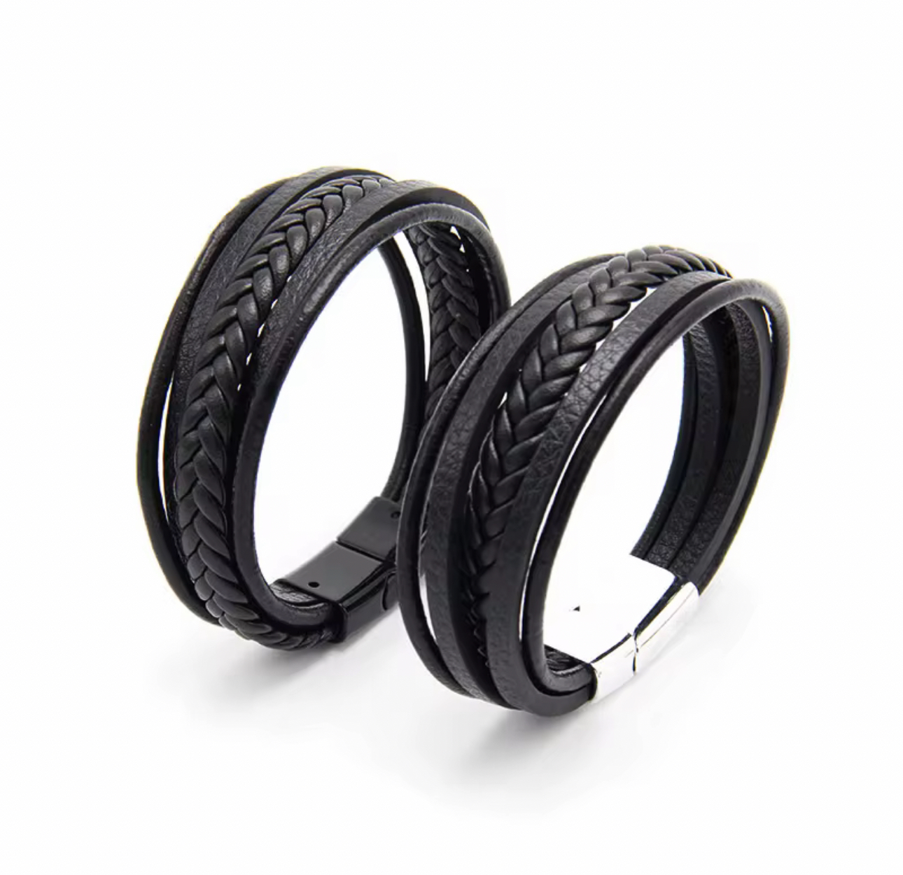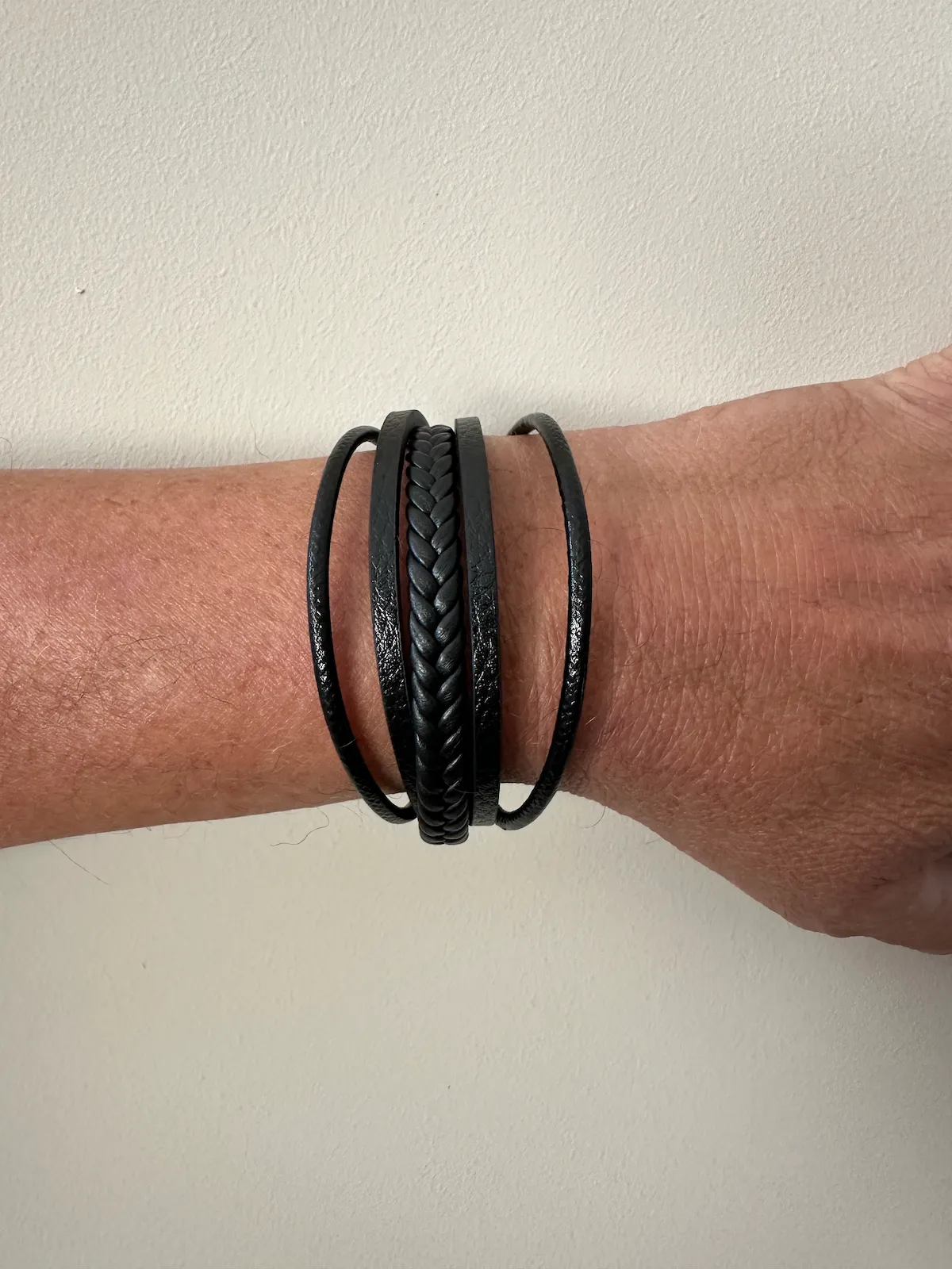Maak je outfit compleet met deze stijlvolle zwarte herenarmband. De armband bestaat uit meerdere leren banden, waaronder een gevlochten detail en strakke gladde banden, wat zorgt voor een robuuste maar toch elegante uitstraling.
