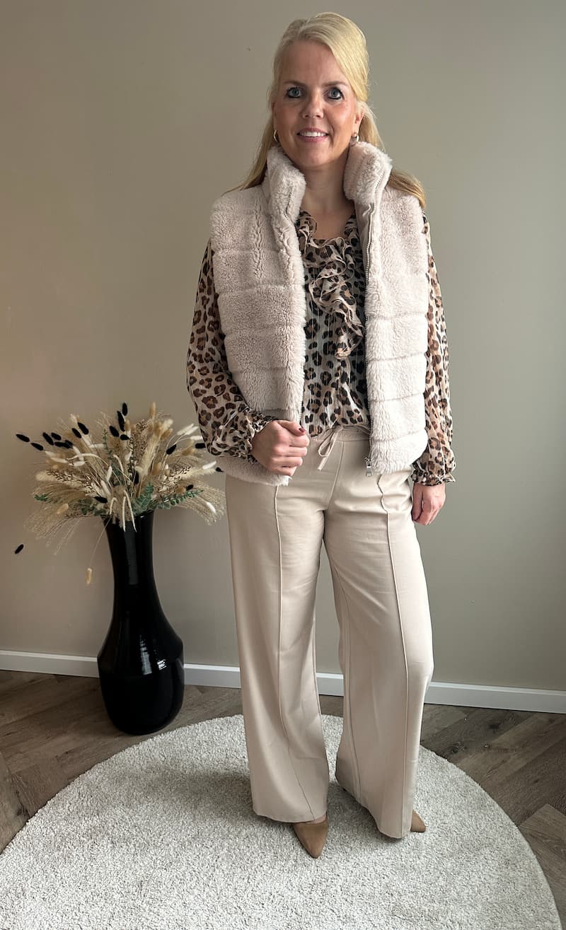 Lekkere warme bodywarmer van het mooie merk Zaza’z.  Een faux fur dames bodywarmer met horizontale stiksels, opstaande kraag en ritssluiting. Dit is een maat L die wat kleiner uitvalt.