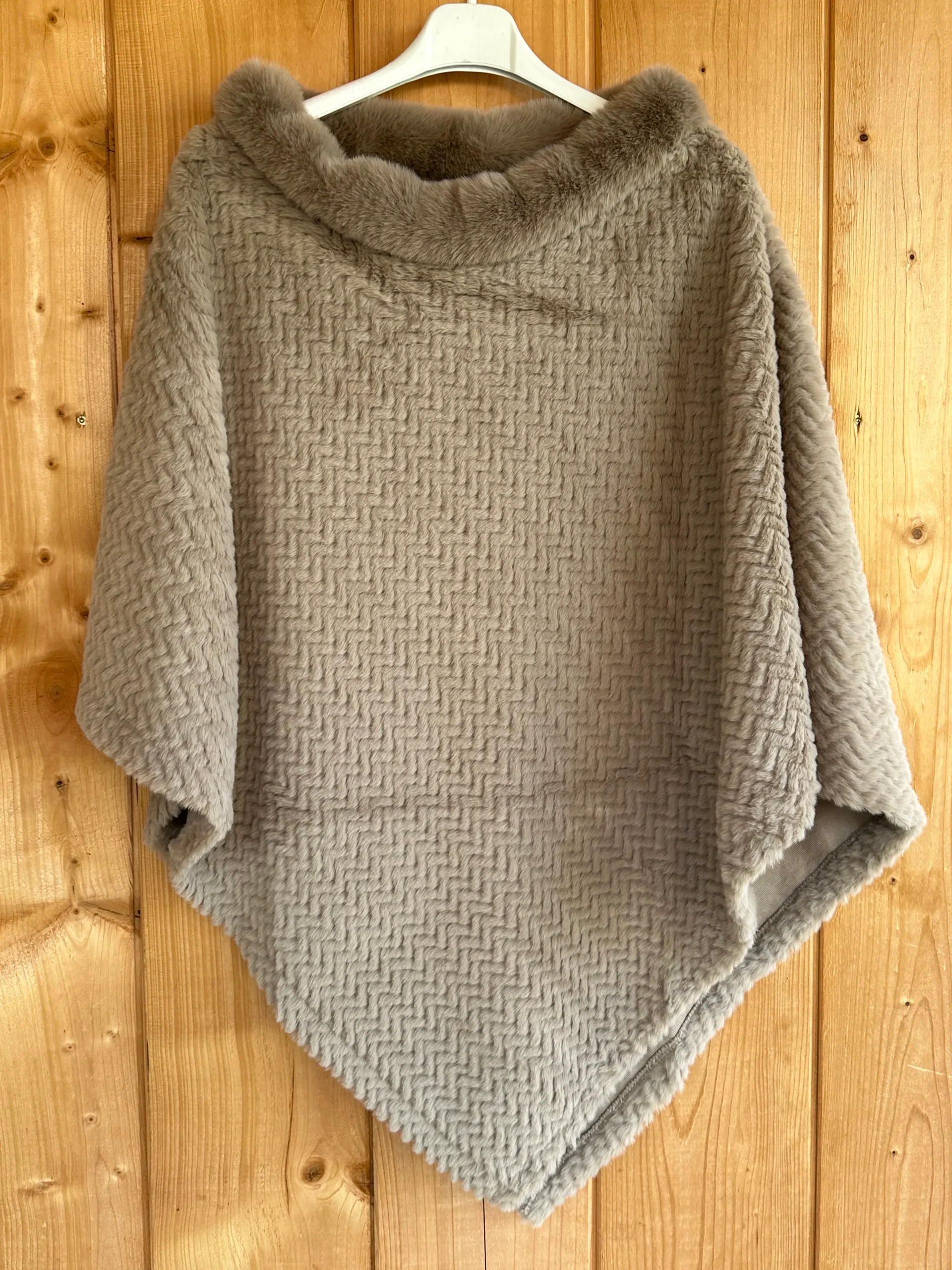 Deze elegante taupe poncho van Zaza’ z is de perfecte mix van warmte en stijl. De zachte faux fur kraag zorgt voor een luxe uitstraling, terwijl het subtiele geweven patroon de poncho een moderne twist geeft.